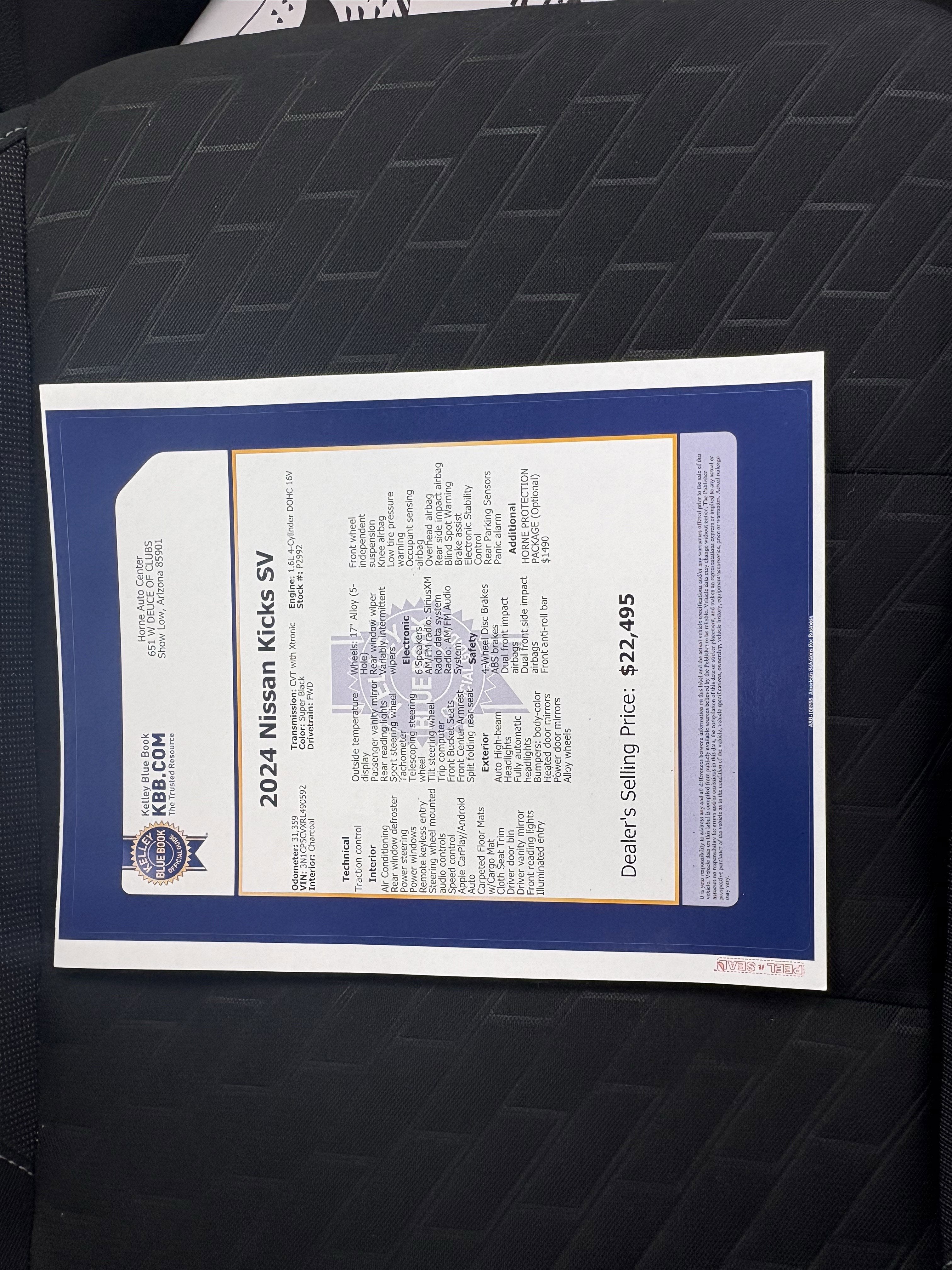 Boasts 36 Highway MPG and 31 City MPG! This Nissan Kicks delivers a Regular Unleaded I-4 1.6 L/98 engine powering this Variable transmission. SUPER BLACK, CHARCOAL, CLOTH SEAT TRIM, [L92] CARPETED FLOOR MATS W/CARGO MAT.*This Nissan Kicks Comes Equipped with These Options *Wireless Phone Connectivity, Vehicle Dynamic Control (VDC) Electronic Stability Control (ESC), Variable Intermittent Wipers, Urethane Gear Shifter Material, Trip Computer, Transmission: Xtronic CVT (Continuously Variable), Transmission w/Driver Selectable Mode and Oil Cooler, Traction Control System (TCS) ABS And Driveline Traction Control, Torsion Beam Rear Suspension w/Coil Springs, Tires: 205/55R17 AS.* Stop By Today *Live a little- stop by Horne Auto Center Inc located at 651 W Deuce Of Clubs, Show Low, AZ 85901 to make this car yours today!