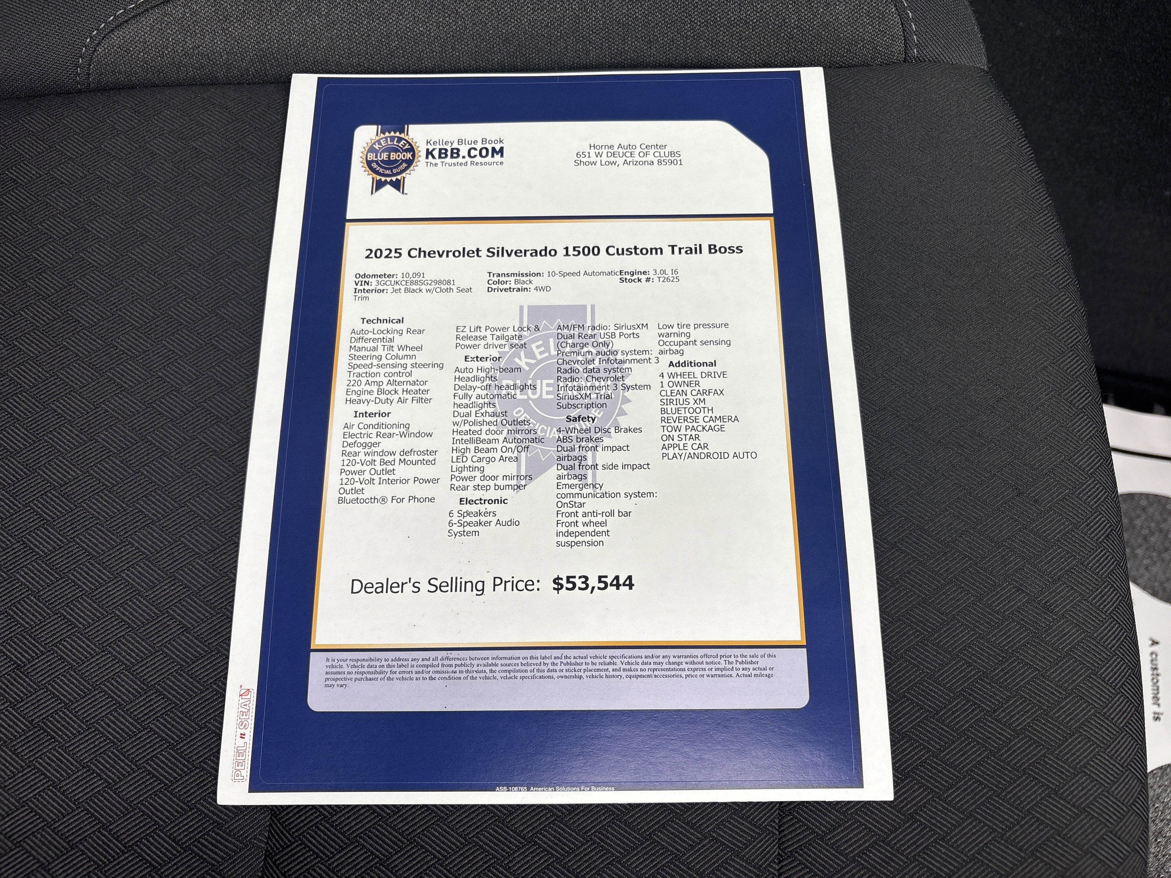 4 WHEEL DRIVE, 1 OWNER, CLEAN CARFAX, SIRIUS XM, Bluetooth®, REVERSE CAMERA, GM CERTIFIED/100K WARRANTY, TOW PACKAGE, ON STAR, APPLE CAR PLAY/ANDROID AUTO, HORNE PROTECTION PACKAGE (Optional) $1490, Silverado 1500 Custom Trail Boss, 4D Crew Cab, 3.0L I6, 10-Speed Automatic, 4WD, Jet Black w/Cloth Seat Trim.2025 Silverado 1500 Custom Trail Boss ChevroletChevrolet Certified Pre-Owned Details:* Powertrain Limited Warranty: 72 Month/100,000 Mile (whichever comes first) from original in-service date* Roadside Assistance* Warranty Deductible: $0* Transferable Warranty* Limited Warranty: 12 Month/12,000 Mile (whichever comes first) from certified purchase date* 172 Point Inspection* Vehicle History* 24 months/24,000 miles (whichever comes first) Certified Pre-Owned Scheduled Maintenance Plan and 3 days/150 miles (whichever comes first) Vehicle Exchange Program. SiriusXM 3-month trial subscription.CARFAX One-Owner. Clean CARFAX.Priced below KBB Fair Purchase Price!Thanks for looking, If you need any additional information we are here to Help ! Need More Photo's or a copy of your Free Vehicle History Report just visit our website www.HorneAuto.com , give us a call at 928-251-4511 , or come visit us in Beautiful Show Low AZ.